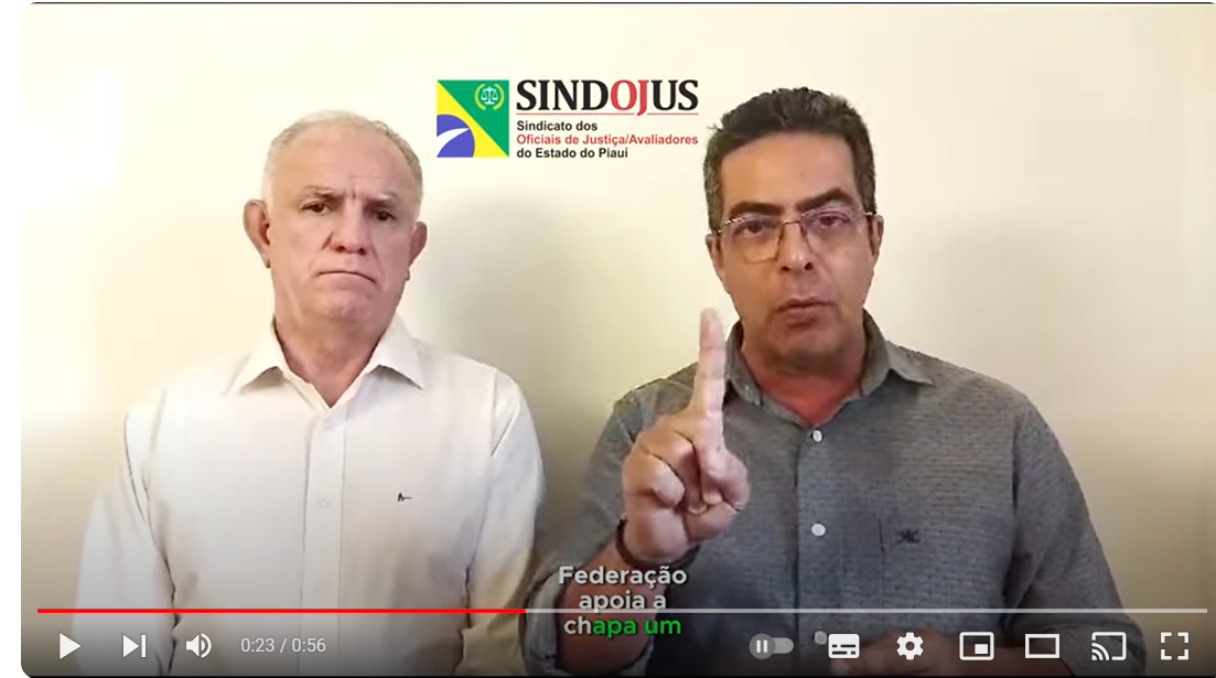 No vídeo, Carlos Henrique Bezerra Sales convoca todos os Oficiais de Justiça filiados ao Sindojus-PI a voltarem na chapa 01, em seguida, João Batista Fernades destaca “É importante salientar, que a parceira entre o Sindojus-PI e Sindsjus-PI é em defesa dos direitos de todos os servidores”.
